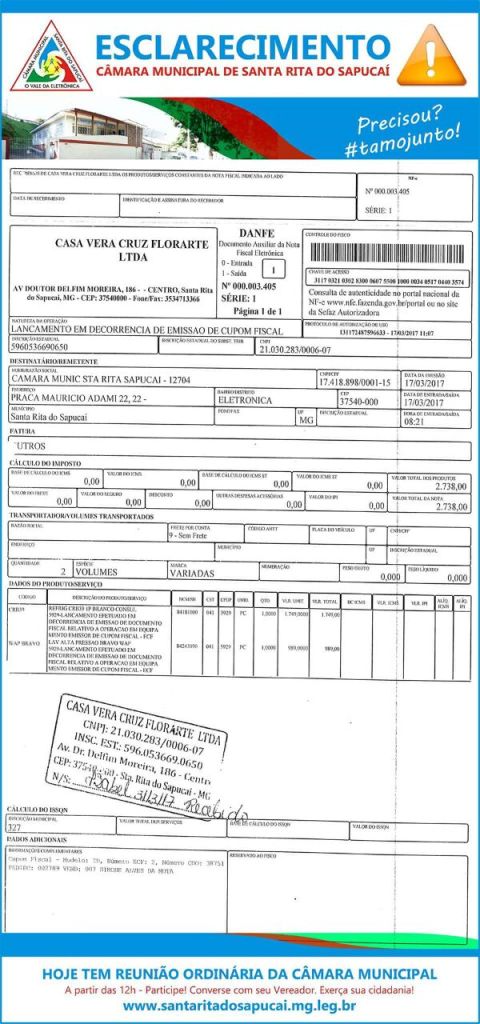 Conforme pode ser verificado na Nota Fiscal Eletrônica n° 000.003.405 Série 1, emitida pela empresa Casa Vera Cruz Florarte, de Santa Rita do Sapucaí, em 17 de março de 2017, o valor total da nota, de R$ 2.738,00 (dois mil setecentos e trinta e oito reais), inclui a aquisição de DOIS ITENS, quais sejam: um refrigerador no valor de R$ 1.749,00 (mil setecentos e quarenta e nove reais) e uma lavadora de alta pressão modelo WAP da marca Bravo, adquirida ao custo de R$ 989,00 (novecentos e oitenta e nove reais). Assim, necessário se faz ressaltar que o refrigerador não custou R$ 2.738,00 (dois mil setecentos e trinta e oito), sendo este o valor total da nota.
