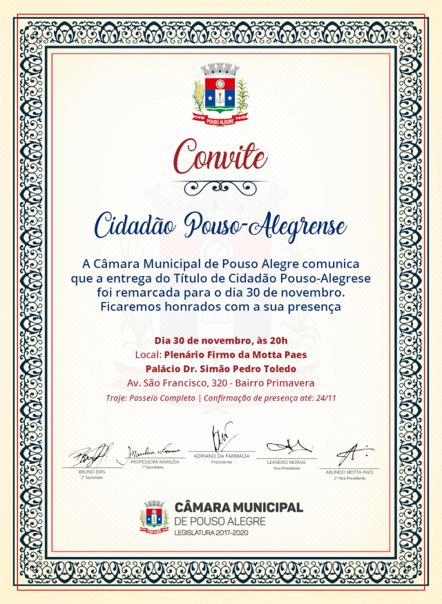 A Câmara Municipal de Pouso Alegre realizará na noite da próxima quinta-feira, 30 de novembro, Sessão Especial para a entrega do Título de Cidadão Pouso-Alegrense 2017. A Sessão Especial começará às 20h, no Plenário Firmo da Motta Paes.