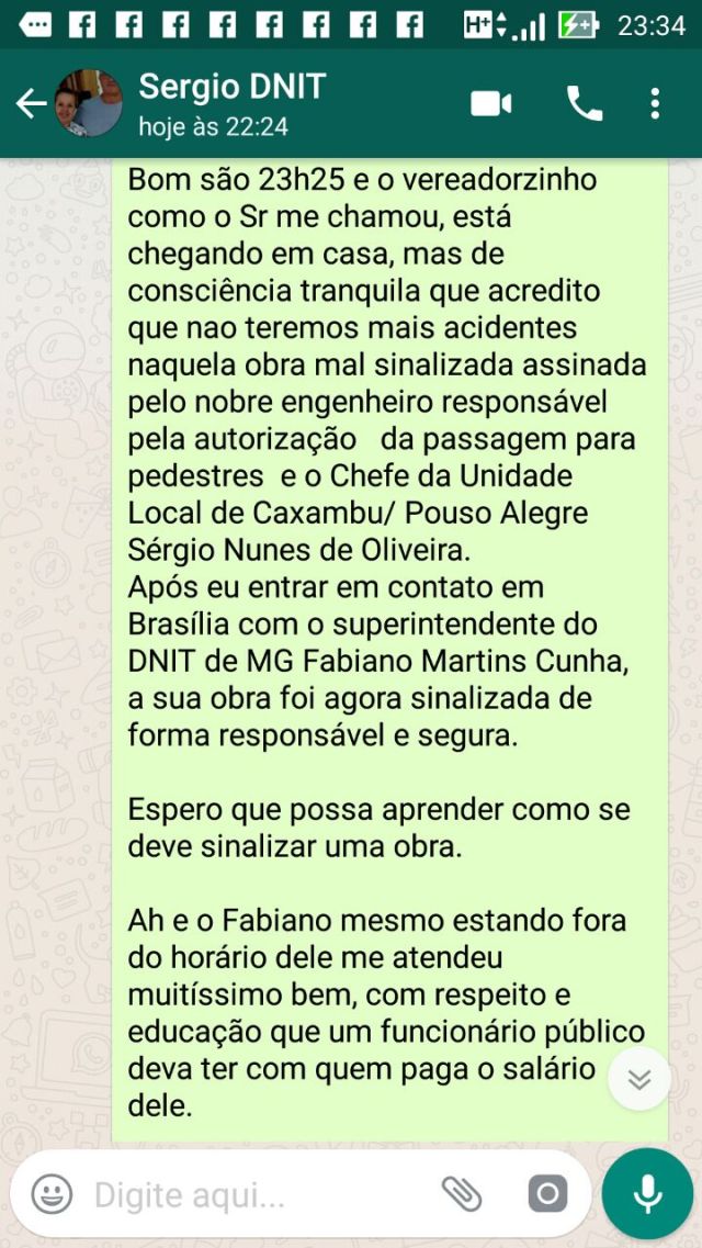 Insatisfeito com a atitude do nobre engenheiro do DNIT, fez contato em Brasília com o Superintendente do DNIT de MG Fabiano Martins Cunha, que prontamente o atendeu e disse que tomaria as providências cabíveis.