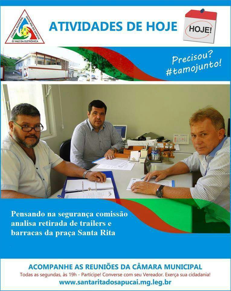 A Câmara Municipal de Santa Rita do Sapucaí vem a público esclarecer que a retirada de trailers e de barracas da Praça Santa Rita, ou qualquer outro espaço público neste Município, não está em pauta em nenhuma comissão permanente ou especial desta casa legislativa. Aliás, é unanimidade entre os vereadores a importância do comércio e artesanato para o lazer, cultura e turismo.