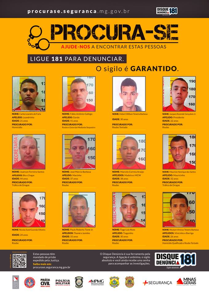 Cartazes também serão espalhados pelos municípios mineiros com as fotos dos procurados em locais de grande circulação de pessoas ou que foram reconhecidos como estratégicos pelas polícias. Todos possuem QR Code para acesso à lista de todos os procurados e outros detalhamentos por meio de smartphones.
