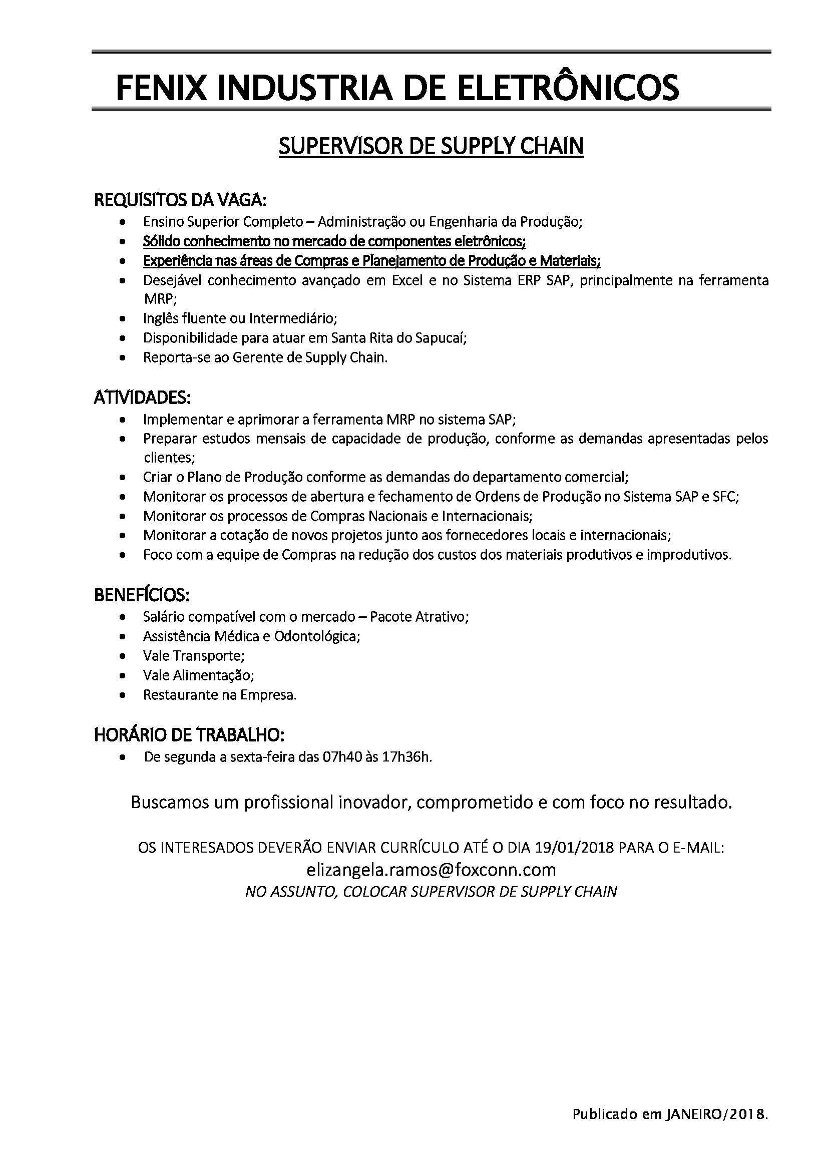 Oportunidade de Emprego – Supervisor de Supply Chain