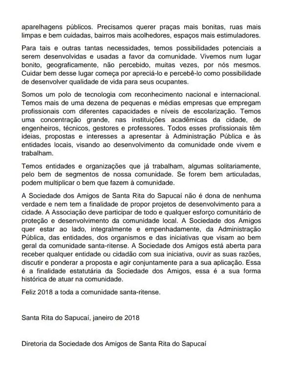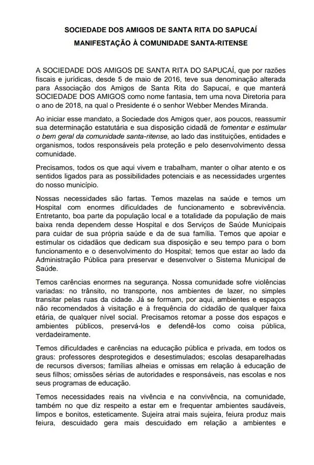 Sociedade dos Amigos de Santa Rita do Sapucaí – Manifestação à Comunidade Santa-Ritense