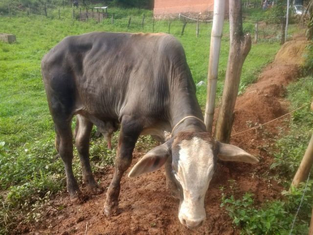 Ainda no pasto da casa do autor, foi encontrado um bezerro de pelagem marrom e branca que estava amarrado com uma corda e muito arredio.