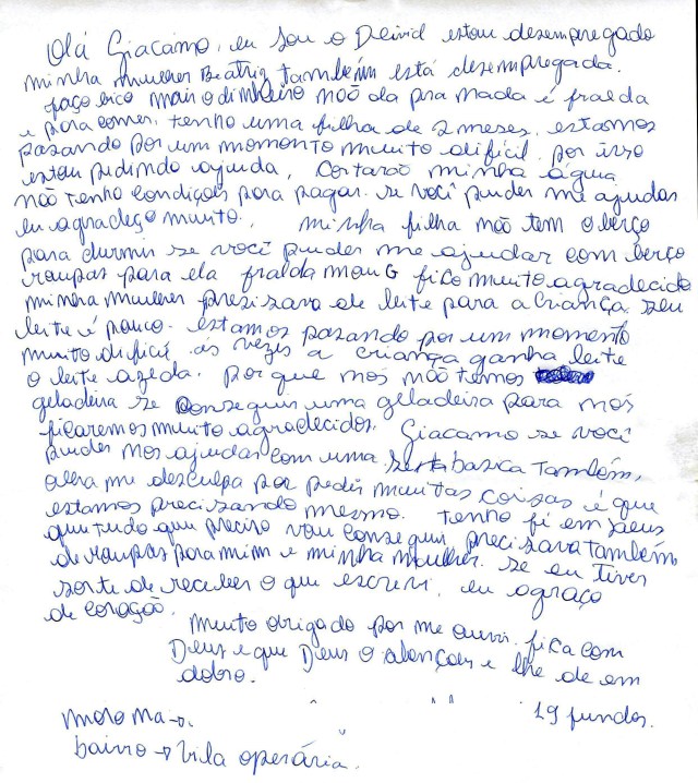 A Corrente do Bem foi procurada por uma família, onde o pai e a mãe estão desempregados e tem uma filhinha de 2 meses, diante disso estão passando sérias dificuldades em relação as contas CEMIG, COPASA, alimentação, materiais de limpeza e higiene pessoal, vejam a carta: