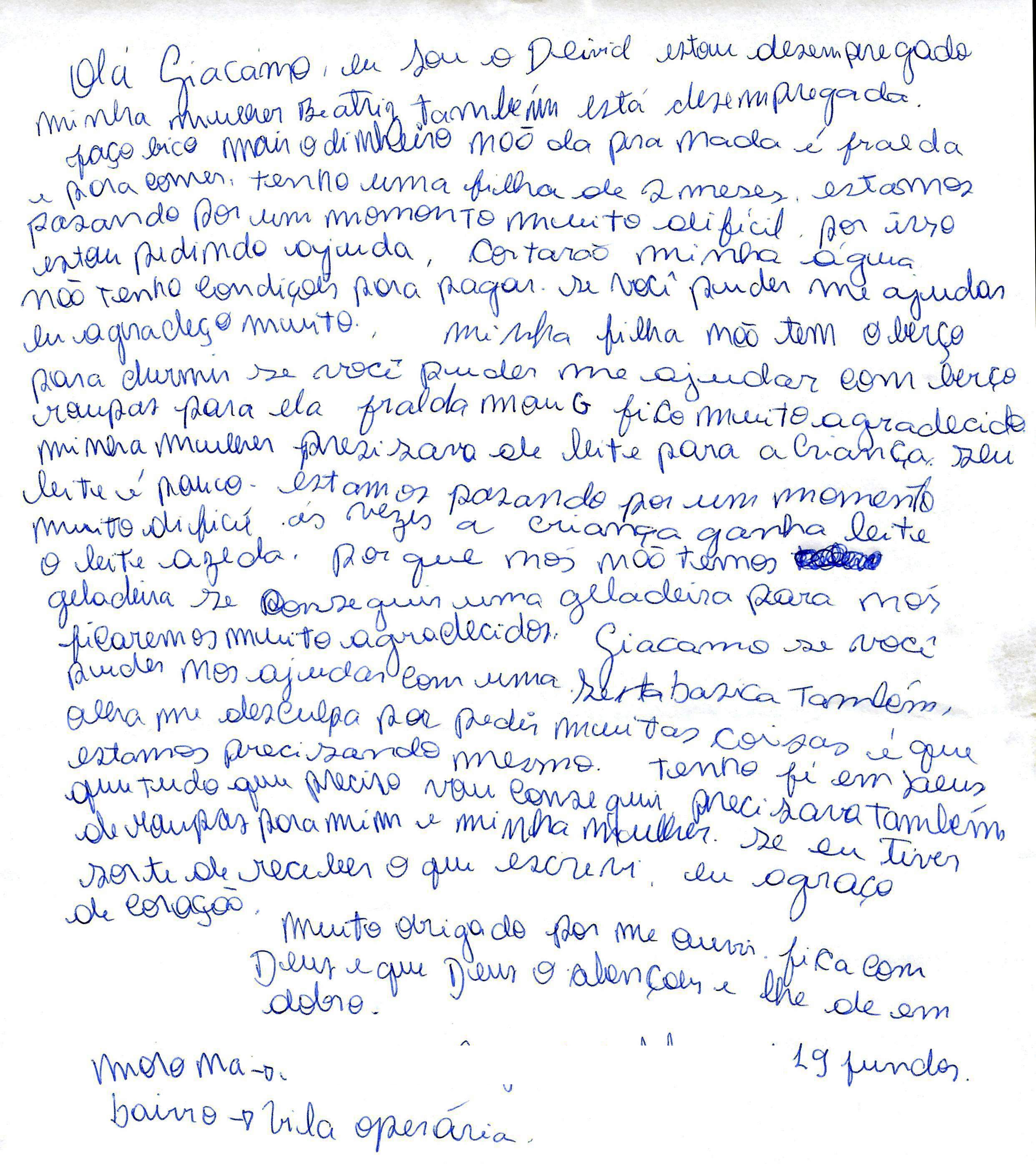 A Corrente do Bem foi procurada por uma família, onde o pai e a mãe estão desempregados e tem uma filhinha de 2 meses, diante disso estão passando sérias dificuldades em relação as contas CEMIG, COPASA, alimentação, materiais de limpeza e higiene pessoal, vejam a carta: