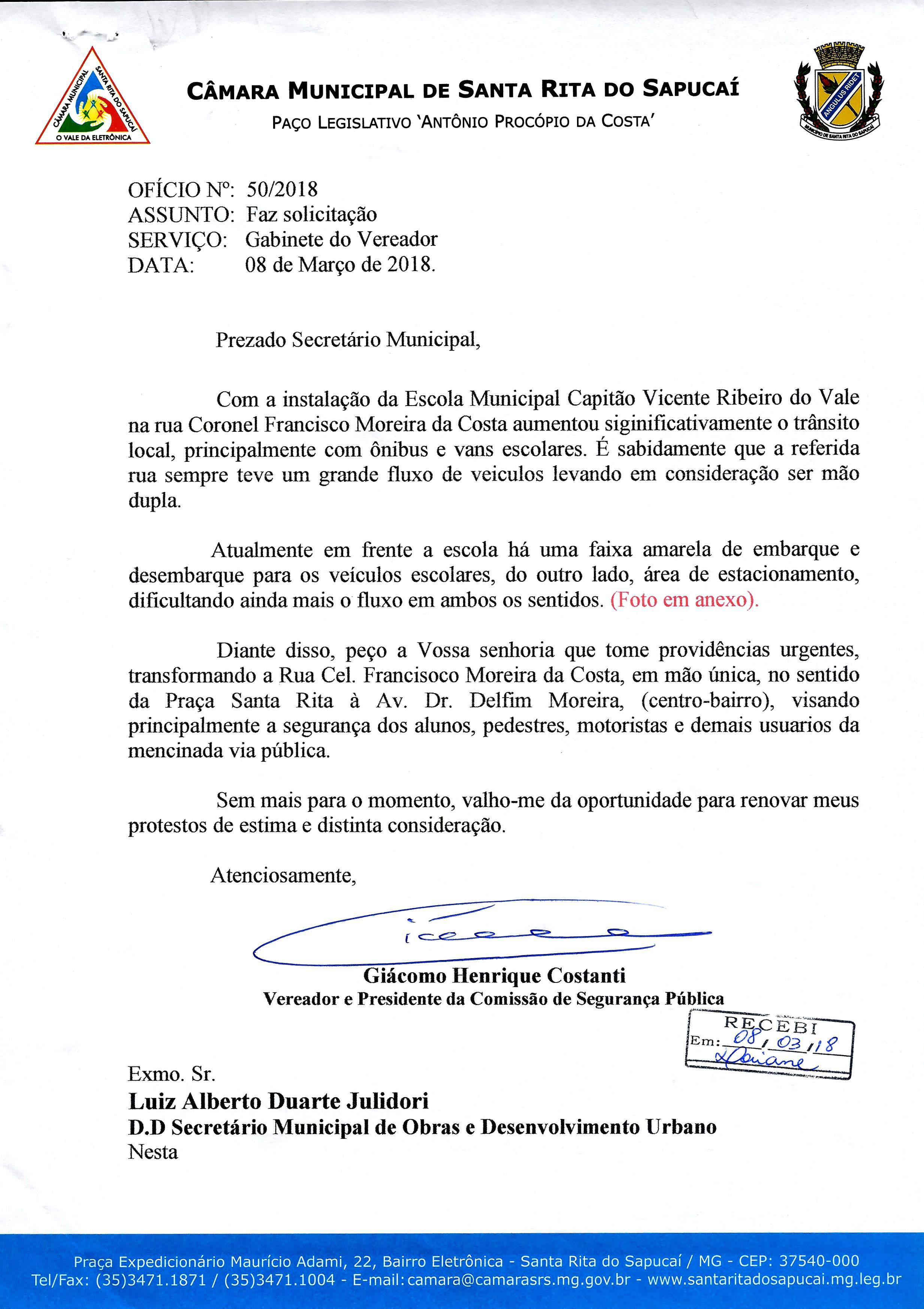 A Comissão de Segurança Pública da Câmara Municipal de Santa Rita do Sapucaí, composta pelos vereadores Miguel Caputo(Relator), Flávio de Castro(Vogal), através de seu Presidente Giácomo Costanti, solicitou ao Sr Luiz Alberto Duarte Julidori, Secretário Municipal de Obras e Desenvolvimento Urbano, a alteração do sentido de trânsito da Rua Cel Francisco Moreira da Costa.