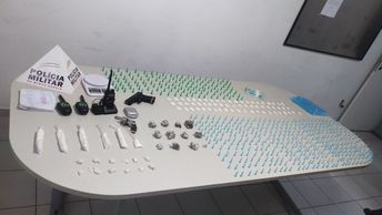 Ainda no quarto do casal, os militares encontraram uma pistola de Airsoft e dois aparelhos de walk talk. No quintal, foi localizada uma bolsa vermelha com 11 porções de maconha, 542 pinos, seis porções, 58 papelotes e 12 sacos de cocaína. Foram apreendidos ainda 3.676 reais em dinheiro, centenas de pinos vazios e duas balanças de precisão.