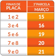 A terceira e última parcela do Imposto sobre a Propriedade de Veículos Automotores (IPVA) 2018 vence a partir desta quinta-feira(15/3), começando com as placas de finais 1 e 2. A escala segue até a quarta-feira (21/3) da próxima semana, sempre com dois finais de placas por dia. Os proprietários devem ficar atentos também à proximidade do vencimento da Taxa de Renovação do Licenciamento Anual de Veículo (TRLAV) – no valor de R$ 92,66 -, que é 2 de abril.