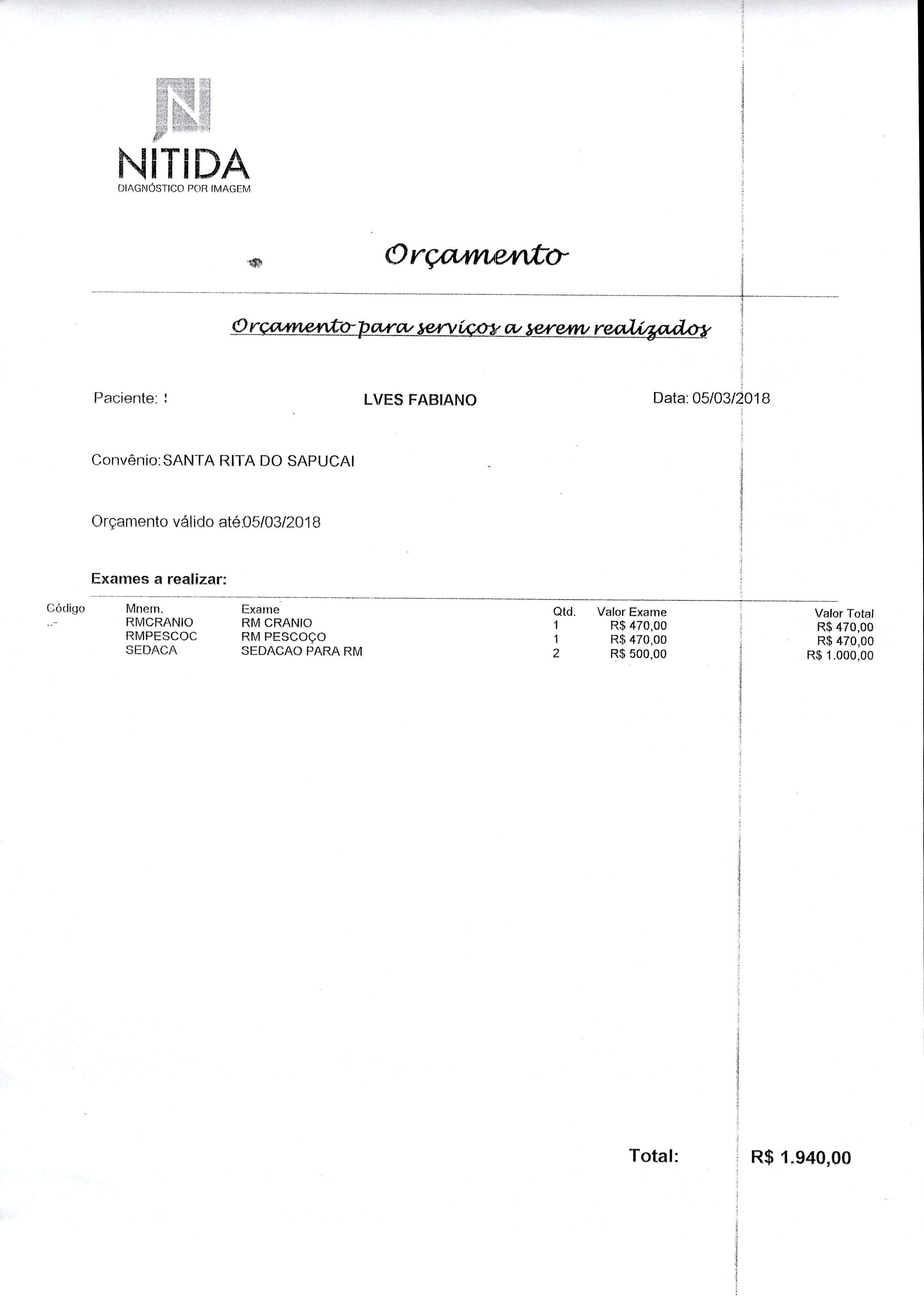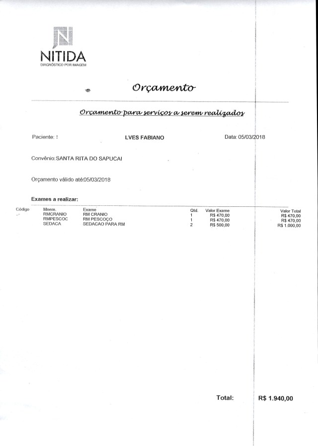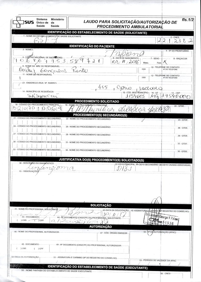 O valor desse exame com o pedido do SUS fica em R$ 1.940,00 e a família não tem condições de pagar.