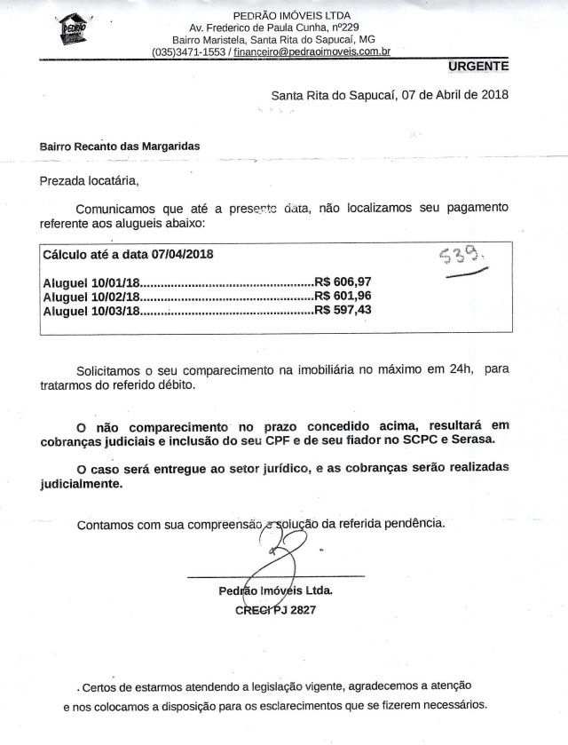 Há ainda 4 meses de aluguel em aberto, perfazendo o total de R$ 2.345,36 conforme o documento abaixo. (Nele está faltando o aluguel de Abril no valor de R$ 539,00):