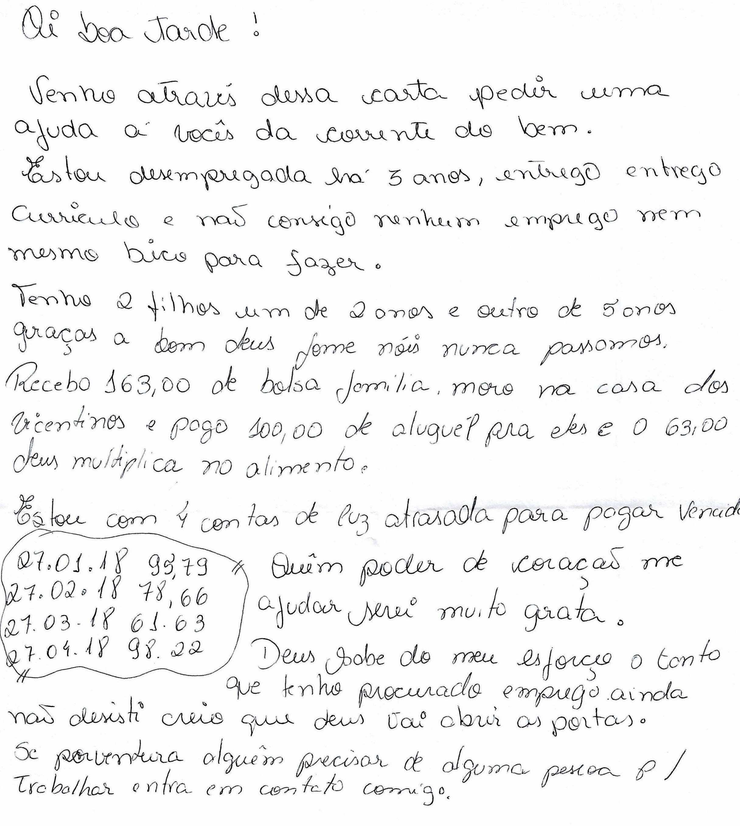 A Corrente do Bem recebeu a seguinte carta de uma mãe em situação difícil: