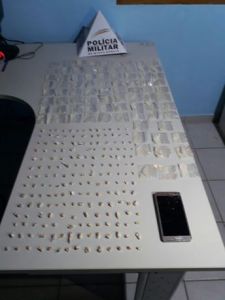 Com a outra adolescente nada foi localizado em sua posse, porém em vistoria no interior do veículo, foi localizado debaixo do banco onde ela se encontrava sentada, uma bolsa pequena preta, contento em seu interior 83 (oitenta e três) papelotes de Cocaína, embaladas e prontas para comércio.
