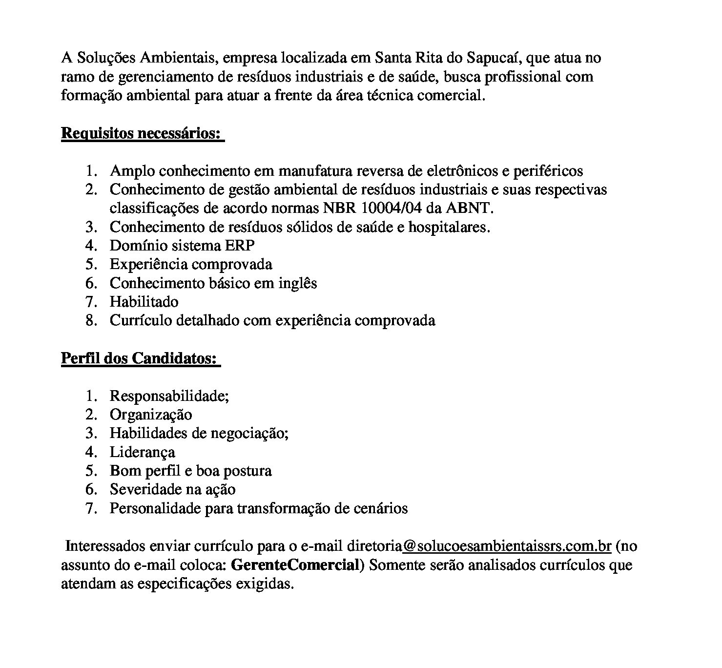 Oportunidade de Emprego – Gerente Comercial