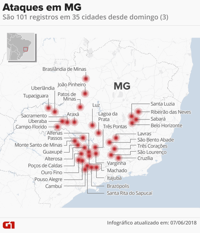 Nesta quinta-feira, o Sul de Minas chegou ao quinto dia seguido com ataques a ônibus e veículos ou prédios de agentes de segurança. A ofensiva começou na noite de domingo (3). Até aqui, foram registrados: 18 municípios atacados; 36 veículos atacados; 12 prédios atacados (sendo 11 de instituições de segurança pública); e mais de 40 prisões de suspeitos de envolvimento nos crimes (10 detidos nesta quinta-feira).