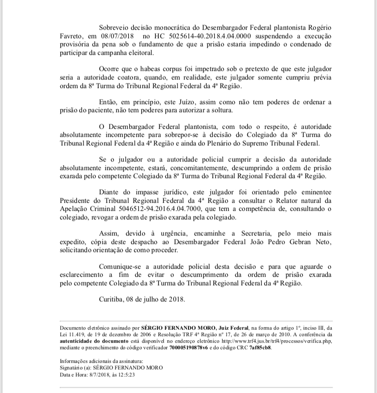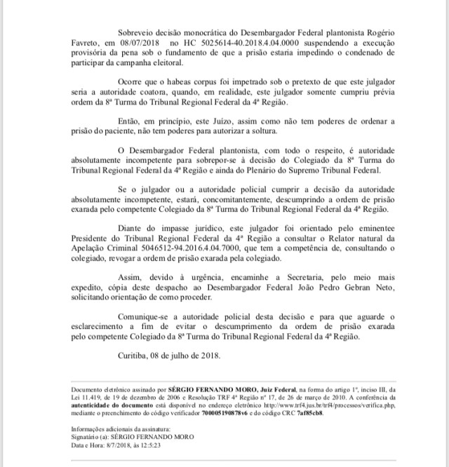 Vejam o despacho que Sergio Moro acaba de emitir à Polícia Federal contra a ordem de soltura de Lula.