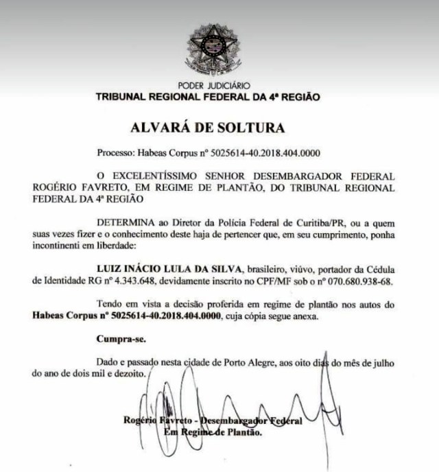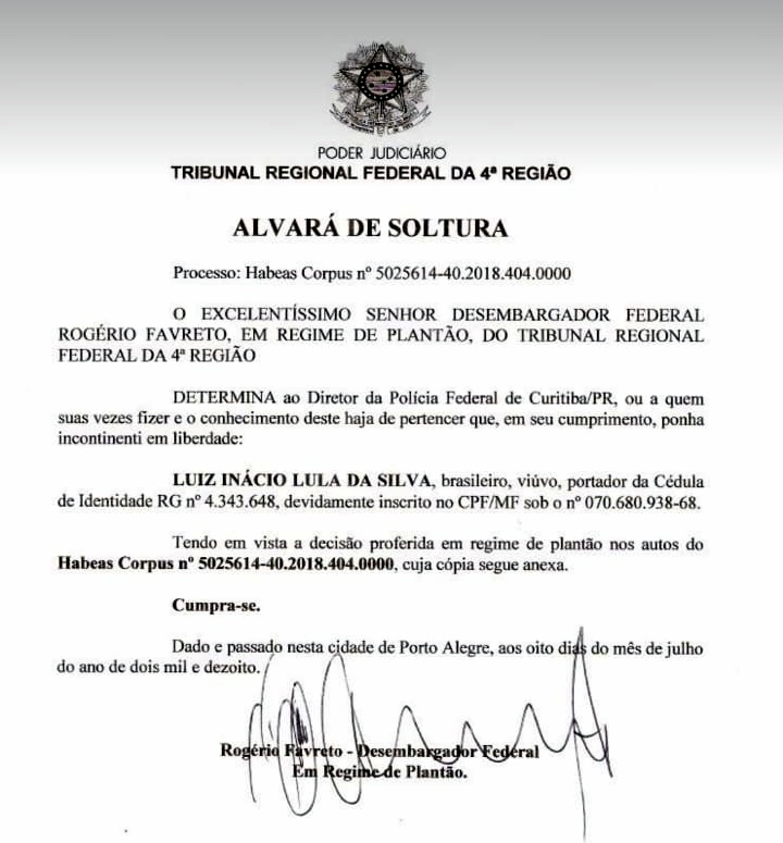 Em decisão divulgada neste domingo (8), o desembargador federal Rogério Favreto do Tribunal Regional Federal da 4ª Região (TRF-4), com sede em Porto Alegre, decidiu conceder liberdade ao ex-presidente Luiz Inácio Lula da Silva (PT), preso desde 7 de abril deste ano em Curitiba. Lula foi condenado na Operação Lava Jato por corrupção passiva e lavagem de dinheiro.