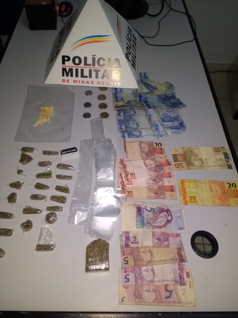 No local foram presos dois autores, 22 buchas de maconha prontas para comercialização, uma pedra bruta de crack, uma barra de maconha, R$ 164,50 em dinheiro trocado, e vasto materiais para embalagem de drogas.