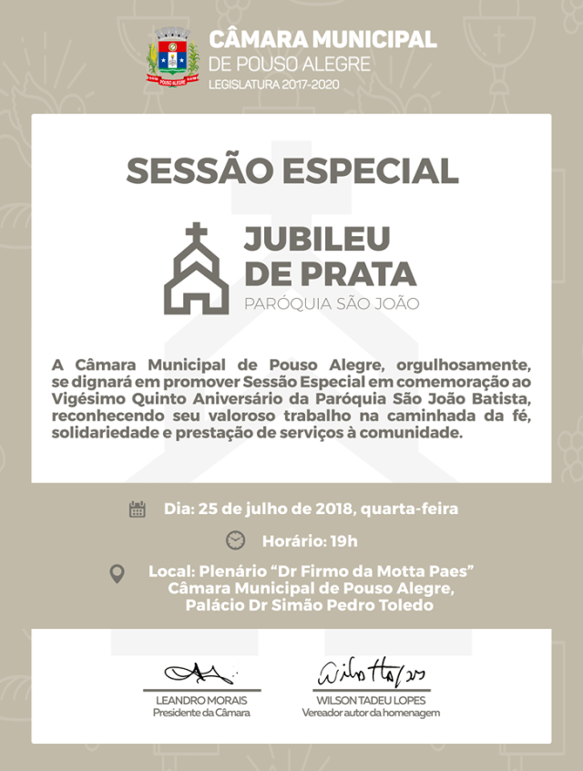 Na próxima quarta-feira, dia 25, a Câmara Municipal de Pouso Alegre promove uma homenagem aos 25 anos da Paróquia de São João Batista. A Paróquia tem grande atuação religiosa e social no bairro São João e adjacências, uma das regiões mais populosas da cidade. A homenagem foi indicada pelo vereador Wilson Tadeu Lopes e está marcada para começar às 19h.