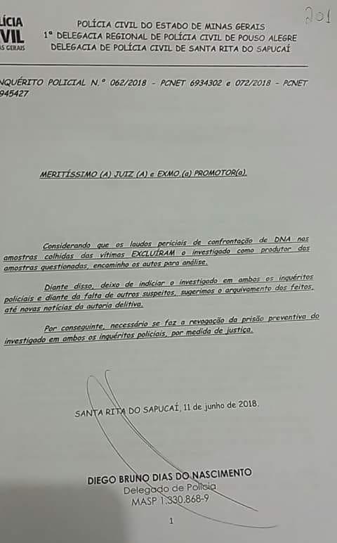 Em Santa Rita do Sapucaí, a Polícia Civil pediu a revogação da prisão preventiva de investigado em dois inquéritos policiais após considerar que os laudos periciais de confrontação de DNA nas amostras colhidas das vítimas EXCLUÍRAM o investigado como produtor das amostras questionadas.