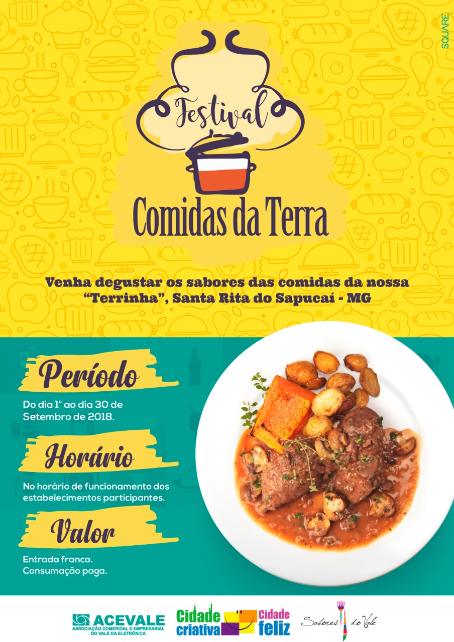 A Acevale, tem a honra de convidar a todos para participar, visitar e degustar das comidas da nossa terrinha de Santa Rita do Sapucaí no Festival Comidas da Terra/CCCF2018, que ocorrerá no período de 01 a 30 de setembro.