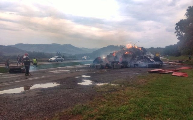 Segundo a Polícia Militar, o motorista percebeu o início do fogo, conseguiu parar no acostamento e desengatar a cabine da carroceria. Ele não teve ferimentos.