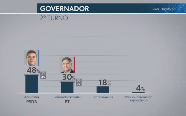 Pesquisa Datafolha divulgada ontem(4) aponta os seguintes percentuais de intenção de voto para o governo de Minas Gerais. A margem de erro é de 3 pontos percentuais, para mais ou para menos.