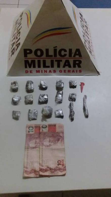 Uma equipe da Polícia Militar, obteve êxito em localizar na posse do cidadão infrator, 16 porções de substância análoga à maconha, um pino de substância análoga cocaína e R$ 20,00.
