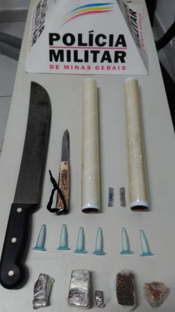 A Polícia Militar deslocou-se e abordou o desocupado de 24 anos, e com ele foi encontrado certa quantia em dinheiro, após busca na residência foi encontrado diversos materiais para embalo de droga uma faca com restos de maconha, 4 porções de maconha, 6 porções de cocaína, uma porção de crack.