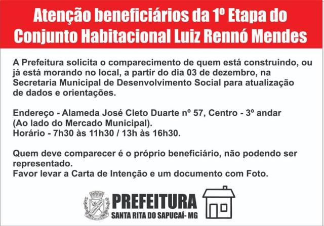 Atenção beneficiários da 1ª Etapa do Conjunto Habitacional Luiz Rennó Mendes