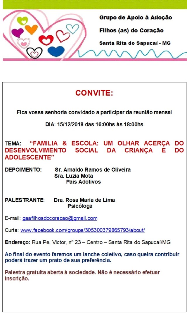 Em nome dos membros do Grupo de Apoio à Adoção Filhos (as) do Coração é que agradecemos a equipe de editores do jornal online – Vale Independente que vem cooperando e socializando nossas publicações ao longo do ano. Estamos encerrando nossas atividades deste ano com nossa reunião mensal. Esperamos contar com o Corpo Docente e Discente dos estabelecimentos de ensino de nossa cidade, pois sabemos que a interação “família – escola” é suporte indispensável a população infanto juvenil no processo de conhecimento. Também sabemos dos desafios: responsáveis ausentes (negligentes), infantes indisciplinados (apáticos) ao processo ensino aprendizagem. Enfim, nossa meta é fazer diferente, a convivência familiar e comunitária saudável é o eixo norteador ou principio para a formação de cidadãos conscientes.