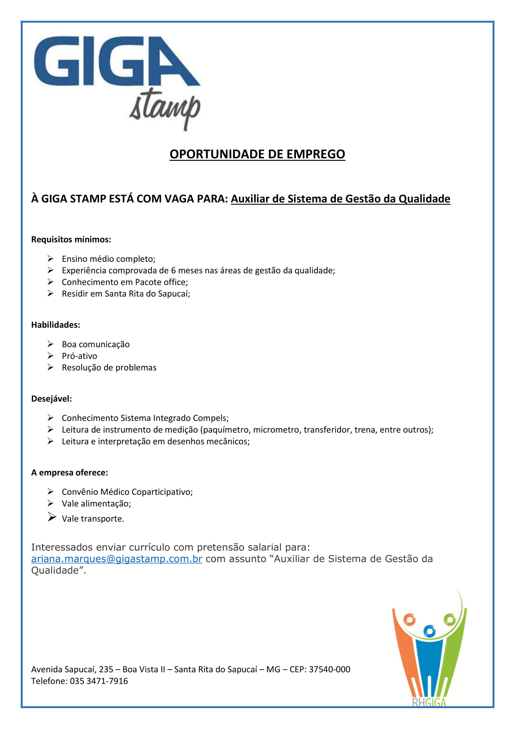 Oportunidade de Emprego – Auxiliar de Sistema de Gestão da Qualidade