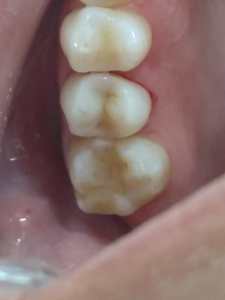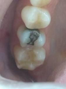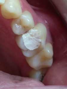Dente com tampão provisório após tratamento de canal.
