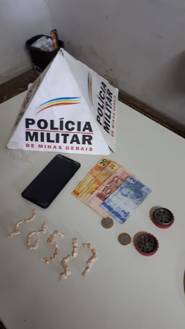 Na abordagem, foram encontradas na boca do suspeito dezenas de unidades de substância análoga ao crack embaladas para venda e quantia em dinheiro no bolso de sua calça.