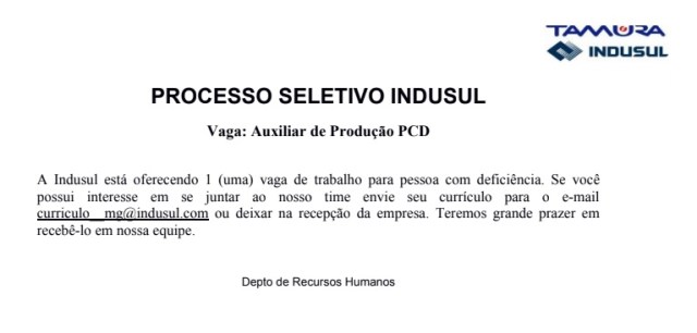 Oportunidade de Emprego – Auxiliar de Produção PCD