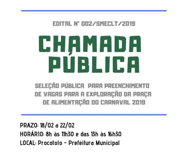 A Prefeitura Municipal de Santa Rita do Sapucaí, através da Secretaria Municipal de Esporte, Cultura, Lazer e Turismo torna a público o presente Edital de chamamento público para concessão de utilização de espaço público para exploração da PRAÇA DE ALIMENTAÇÃO DO CARNAVAL 2019.