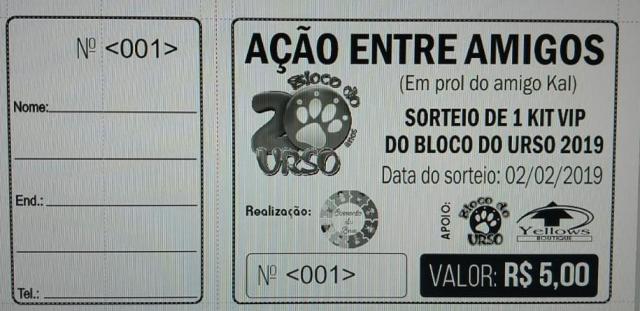 Mais uma forma de ajudá-lo é adquirindo uma rifa que concorrerá a um KIT VIP BLOCO DO URSO 2019.