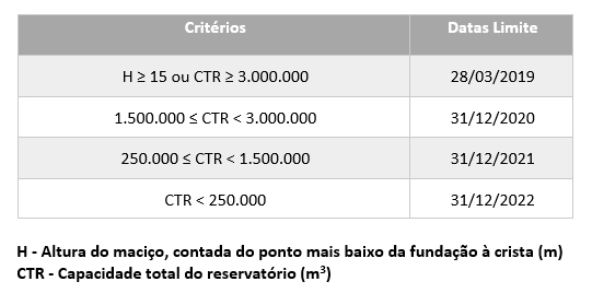 Os usuários de recursos hídricos que possuem barragens instaladas em cursos d’água para fins de acumulação de água devem realizar o cadastro dessas estruturas junto ao Instituto Mineiro de Gestão das Águas (Igam). O cadastramento começa a partir desta quarta-feira, 27 de fevereiro, e vale até o dia 28 de março, para barragens com altura maior ou igual a 15 metros e/ou volume igual a 3 milhões de metros cúbicos. O prazo se estende até o dia 31 de dezembro dos anos de 2020, 2021 e 2022, a depender do volume do reservatório do reservatório (ver tabela abaixo).
