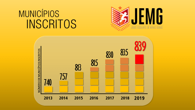 Os Jogos Escolares de Minas Gerais (Jemg) alcançaram nova marca em 2019. Em mais um recorde, o maior evento esportivo-social do Brasil recebeu inscrições de 839 dos 853 municípios mineiros, o que representa mais de 98% de adesão das cidades à competição. O resultado contabilizado nessa segunda-feira (11/3), prazo final para as inscrições, superou o do ano passado, que havia chegado a 835 municípios.