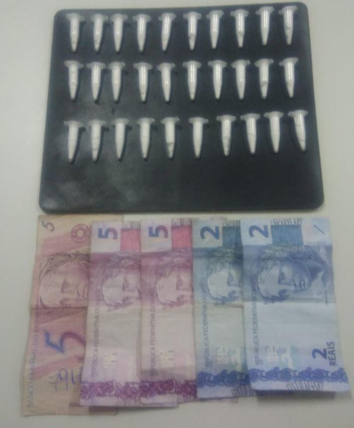 Após vasculhamento próximo onde o menor se encontrava, foi localizado escondido em um lote vago 30 pinos de cocaína e R$ 20,00 em dinheiro.