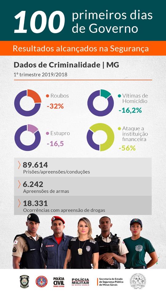 O número de roubos em Minas Gerais caiu 32% no primeiro trimestre deste ano, em comparação com o mesmo período do ano passado. Foram 7.110 registros de roubos a menos nos três primeiros meses de 2019, o que significa a redução de 79 ocorrências por dia deste tipo de crime no estado.
