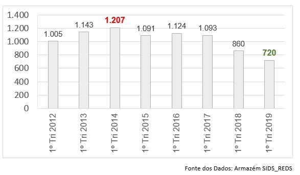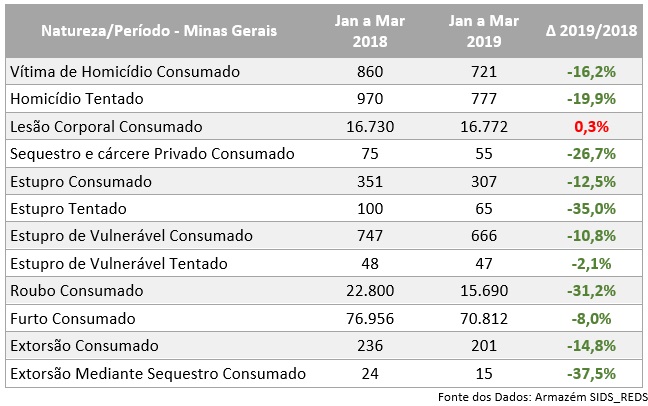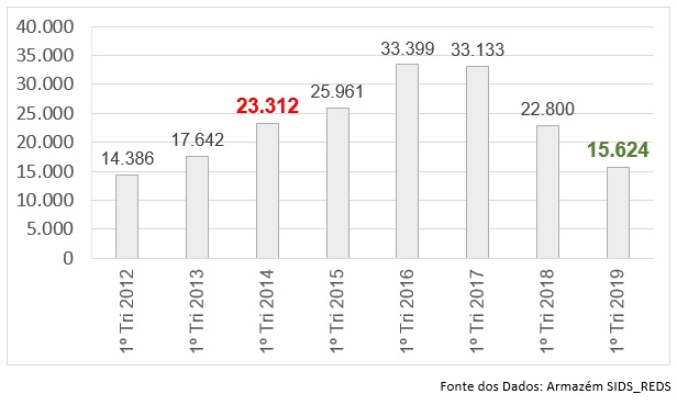 Os 22.800 registros da modalidade entre janeiro e março de 2018 caíram para 15.690 em 2019. O resultado é o melhor dos últimos sete anos em Minas Gerais e aponta para uma aproximação de resultados do ano de 2012.