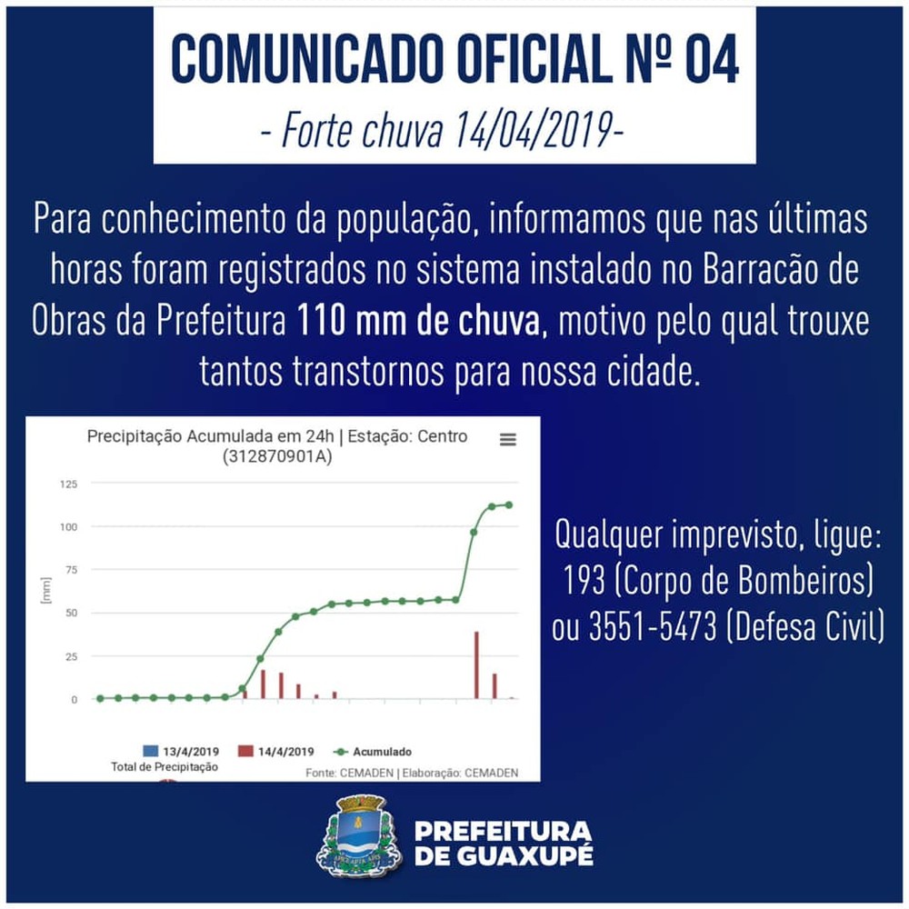 Segundo a prefeitura, a chuva que começou por volta das 16h00 fez o Rio Guaxupé transbordar. Não houve registros de feridos.