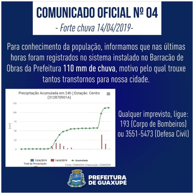 A prefeitura divulgou um comunicado oficial nas redes sociais informando que foram registrados 110 milímetros de chuva na cidade no acumulado das últimas 24 horas.