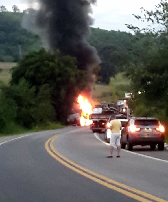 Em Piranguinho, uma carreta pegou fogo na BR459, próximo à Olegário Maciel.