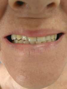 Por essa foto, sem examiná-la já notamos os dentes muito amarelos, bem tortos e inclinados e com grande desvio da linha média. Percebam que a linha do meio entre os arcos superior e inferior não coincidem.