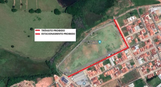 Em Santa Rita do Sapucaí, a Secretaria Municipal de Transporte, Trânsito e Mobilidade Urbana comunica que durante dos eventos no Centro Municipal de Eventos Prefeito Dr Antônio Teixeira dos Santos, será proibido o TRÂNSITO e ESTACIONAMENTO na área marcada em vermelho no mapa abaixo: