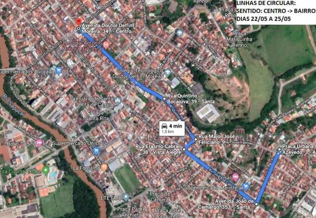 Em Santa Rita do Sapucaí, a Secretaria Municipal de Transporte Trânsito e Mobilidade Urbana comunica a todos que em virtude da Festa de Santa Rita e também das comemorações dos 127 anos de emancipação política do nosso município, as linhas de circular terão alterações em seus itinerários do dia 22 à 25 de Maio.