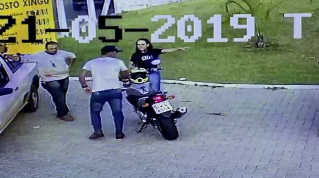 Câmeras de segurança registraram parte da briga. Nas imagens, é possível ver que a motorista estaciona, sai do veículo e faz uma ligação pelo celular. O rapaz chega na moto pouco tempo depois e a briga começa. Outras pessoas participam da discussão.