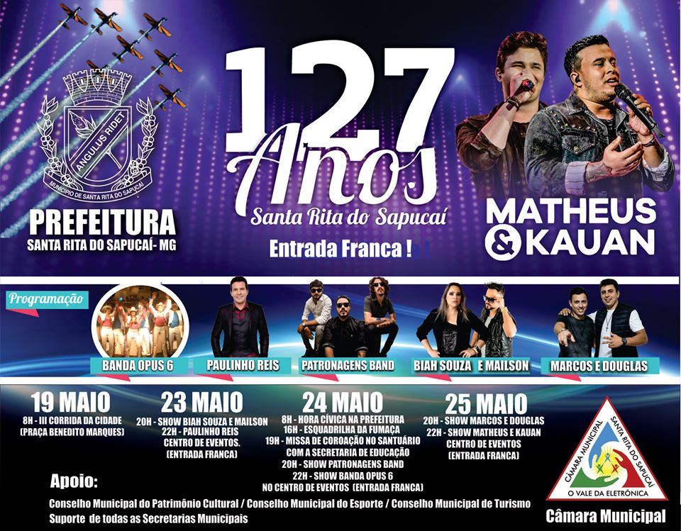 Realização Prefeitura Municipal de Santa Rita do Sapucaí através da Secretaria Municipal de Esporte, Cultura, Lazer e Turismo.
